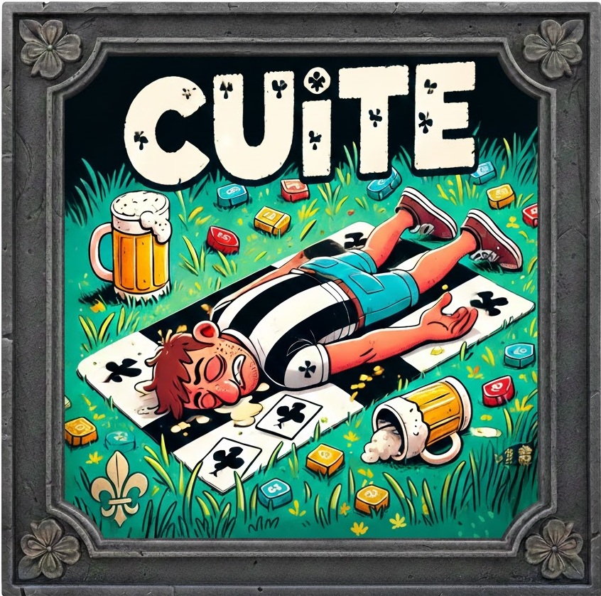 🍾 La cuite… Ton joueur ne peut plus se défendre pendant ce tour. Si un adversaire assez vicieux choisit de t’affronter en duel… Eh bien, ne cherche pas : tourne la roue des supplices ! PS une cuite est une cuite, dans une tranchée ou au soleil c’est la même !